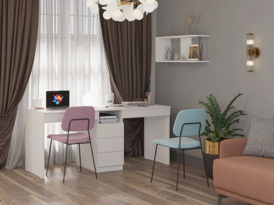 Письменный стол обладает лаконичным дизайном и поэтому впишется в любой интерьер. Поставьте его в детскую, офис, рабочий и учебный кабинет. Классическая прямоугольная столешница позволяет разместить на ней все необходимые вещи, в том числе ноутбук, монитор, клавиатуру и настольную лампу. Имеется 3 вместительных ящика посередине на шариковых направляющих, а также под каждым рабочим местом. Стол рассчитан на двух детей.