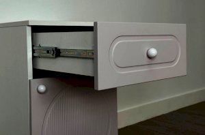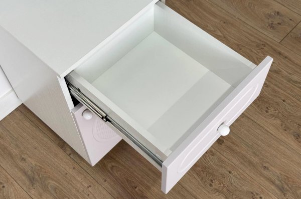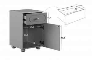 Модель оснащена выкатным ящиком на шариковых направляющих, обеспечивающих плавный и надёжный ход. В нижней части расположено отделение с распашной дверцей, которое подойдёт для хранения книг, игрушек, аксессуаров или текстиля.