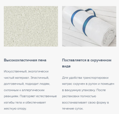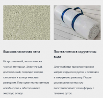 Матрас Flex Soft произведен на основе монолитного блока из гипоаллергенного, влагоустойчивого и долговечного материала Foam благодаря высокой степени упругости обеспечивает идеальный анатомический эффект. Чехол на матрас изготавливается из синтетического жаккарда, простеганного на синтепоне. Благодаря составу чехол хорошо пропускает воздух и сохраняет тепло. Для удобства транспортировки матрас скручен в рулон и помещен в вакуумную упаковку. После распаковки полностью восстанавливает свою форму в течение суток.