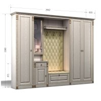 Прихожая выполнена в классическом стиле с декоративными элементами. Фасады и декоративные элементы патинированы, патина наносится вручную, по классической итальянской технологии и защищена матовым лаком. Мягкие элементы (вешалка и сиденье) выполнены из экокожи, декорированы каретной стяжкой.