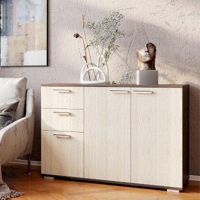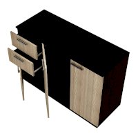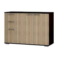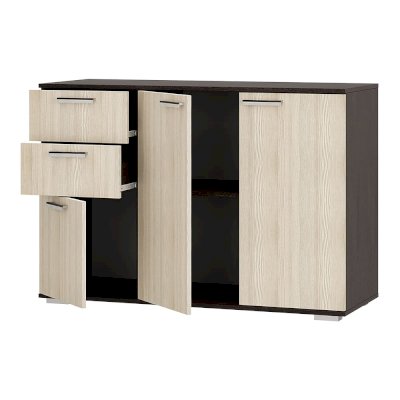 Комод Стандарт №3 шириной 1200 мм имеет необычное размещение полок и ящиков. Основная часть изделия состоит из двух распашных дверок, за которыми находятся места для хранения вещей. Левая часть комода представляет собой два выдвижных ящика и нижнюю секцию также с распашной дверцей и полками.